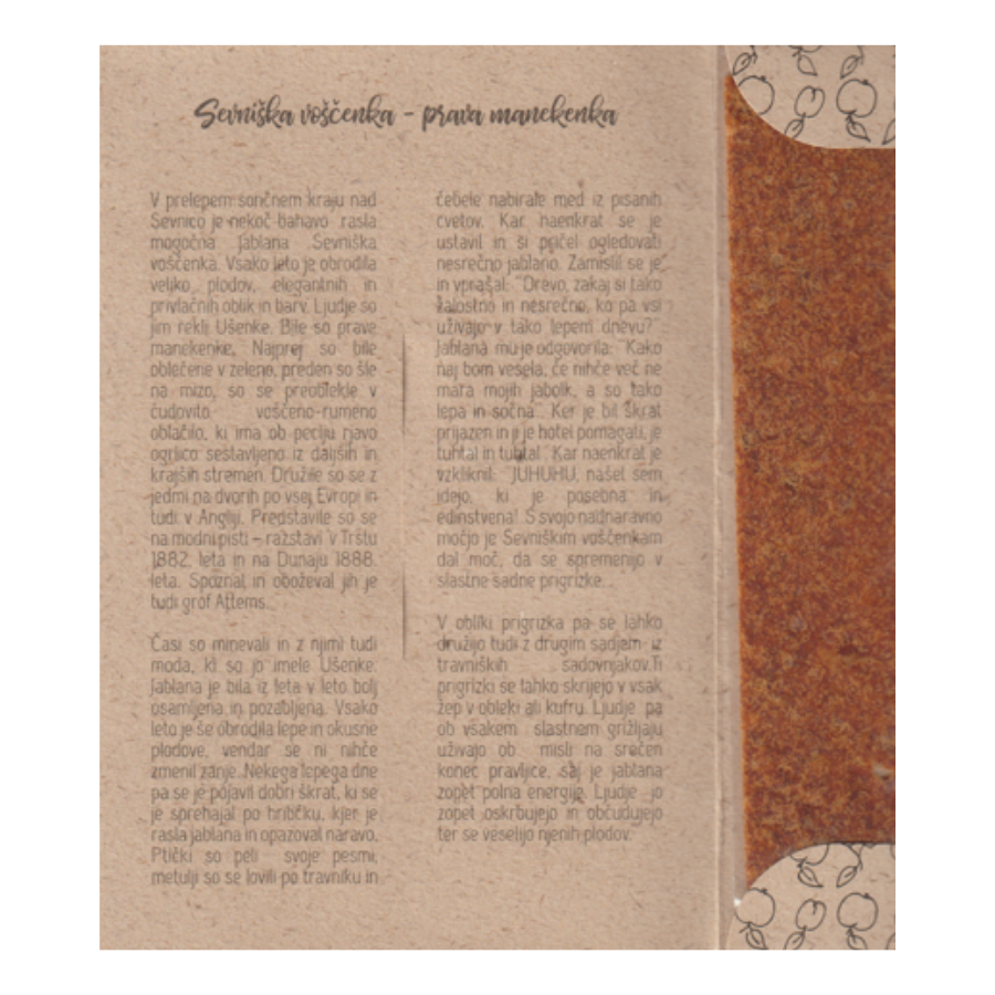 Na Centru biotehnike in turizma Grm Novo mesto dozorele plodove, ki ob svojem času sami odpadejo, skrbno očistijo in zmeljejo, z olupki, seveda, ki vsebujejo največ zdravju koristnih polifenolov in vlaknin. Jabolčno kašo še svežo tanko namažejo na pladnje in jo pri nizki temperaturi počasi sušijo. Plodovi, ki naravno dozorijo na sončnih pobočjih travniških sadovnjakov, so polnega, prvinskega okusa. Od sorte do sorte se razlikuje tekstura, ki je spodaj gladka in zares spominja na usnje, zgoraj pa se lahko spremeni v prav umetelno čipko.